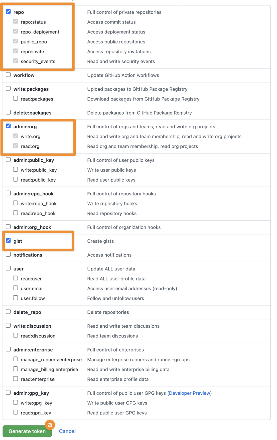 아래의 repo , admin:org, gist 부분의 체크박스를 하고 generate token 를 만듭니다.