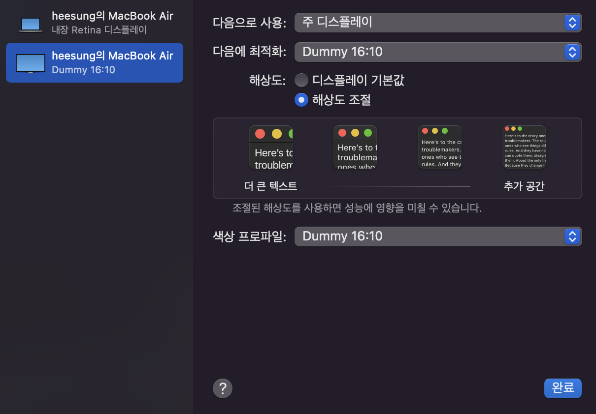 디스플레이 설정을 아래와 같이 했습니다.