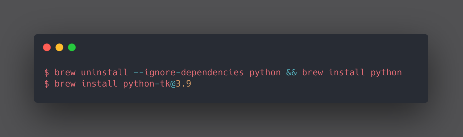 MAC 터미널에서 기존 python3을 지우고 다시 설치 및 tk 버전을 지정하여 설치합니다.