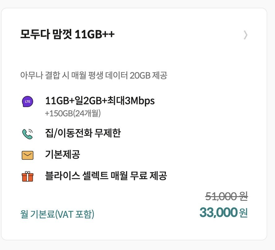 11기가와 2기가에 메리트가 있을 듯 하였다. 더불어 데이터 쉐어링 유심도 같이 등록하였다.