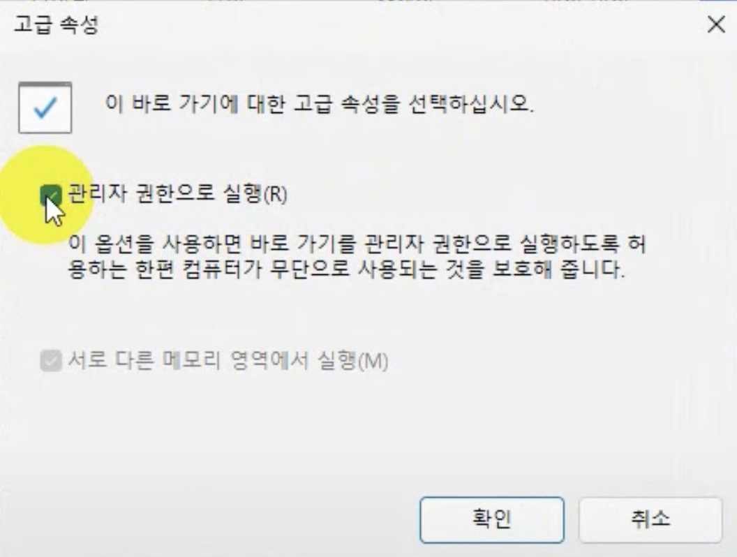 다 만들고 나서는 고급속성에서 아래의 관리자 권한 실행을 해주셔야합니다.