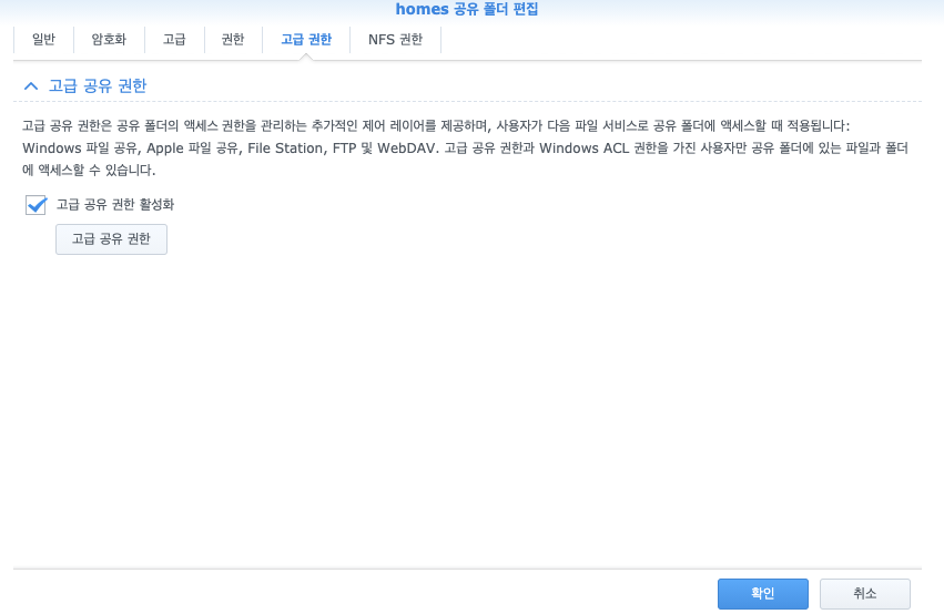 고급권한 탭에서 고급 공유 권한 활성화 한다.