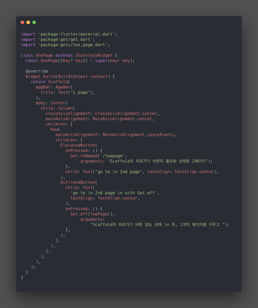 버튼을 보면 1개는 toNamed 를 이용하고, 1개는 Get.off 기능으로 하였습니다.